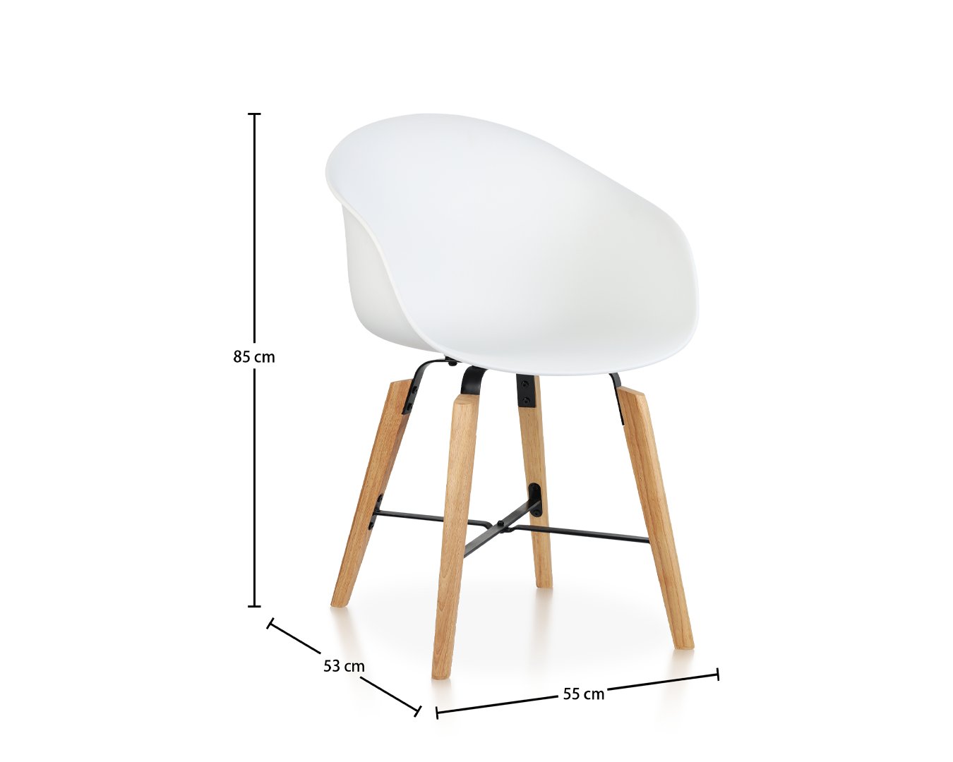 • Kalıplı polipropilenden üretilen koltuk dayanıklı ve temizlenmesi kolaydır. Kauçuk ahşap bacaklar ve siyah toz kaplı demir konektörler, tüm beyaz görünüme sıcaklık ve kontrast katar.